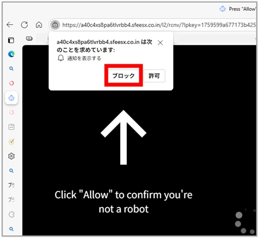 このサイト、アクセスするとreCAPTCHAもどきが現れ、クリックすると何かの通知の許可を求めてきます。あきらかに怪しい。。。