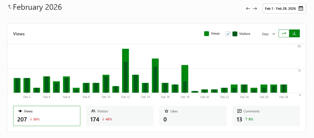 ページ表示回数226回で、実際にページが表示されたと思われる回数(session start)が198回 —— 今回はJetpackよりも多めに出てきました。初回訪問は190回とあり、これは良いのか悪いのか。。。