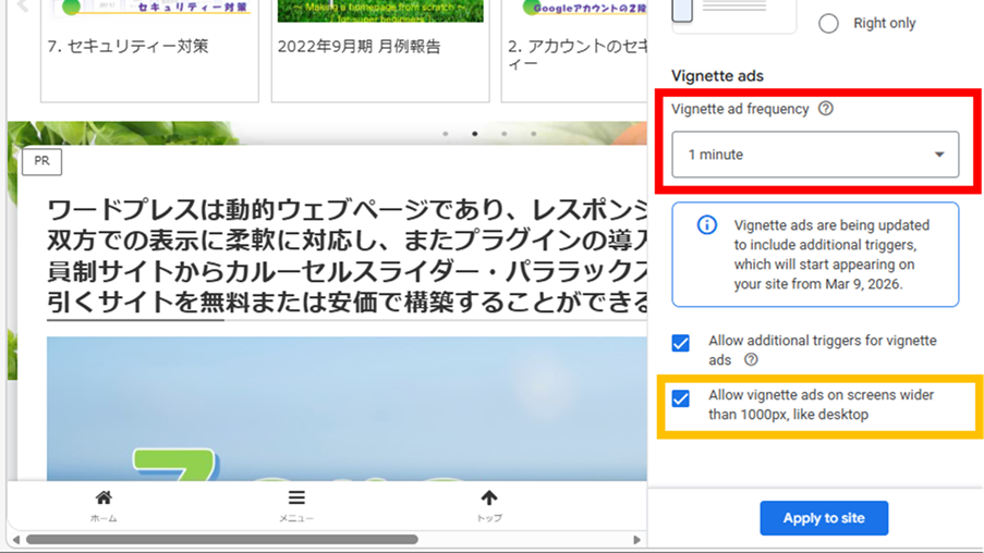 しかしこれならAIもバッテンマークを押せないだろうことを期待し、広告表示間隔もゲスに1分間隔に設定してしまいます。Googleアナリティクスで1分以上滞在する人は少ないことは分かっているので、あまり気にしません (^_^;。