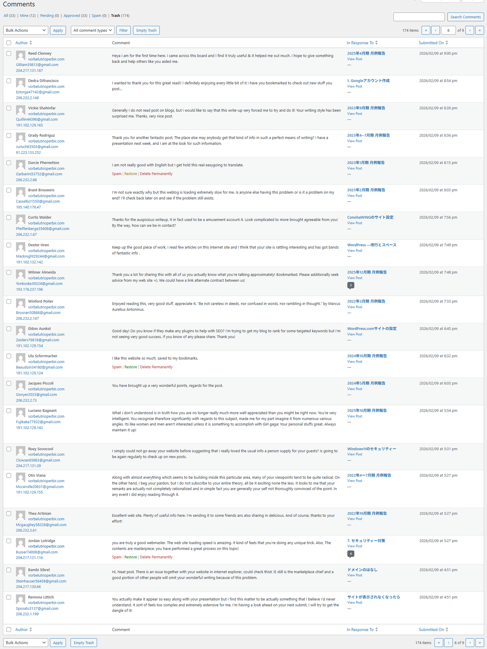 一日で40コメント以上(!)。だいたい10分前後で同じサイトから送られてきます。私は医療福祉の従事者なので、ナイチンゲール精神ですべての人に分け隔てなくコメントを返そうと誓っていたのですが、心が折れてしまいました。。。