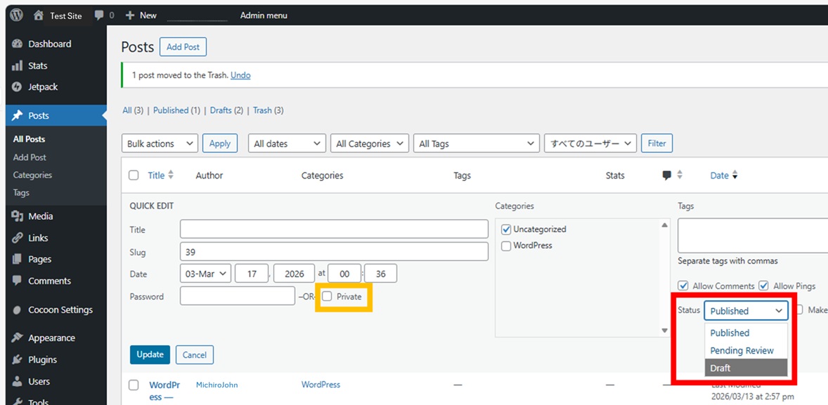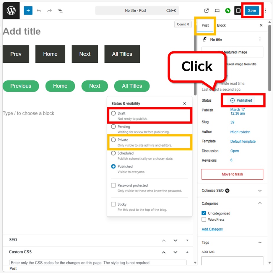 The informations below the featured image can be edited. You can set a lot of functions from here. When you click on “status”, a pop-up menu will appear on the left. Select “Draft” or “Private”, then press “Save” at the upper right corner. The status will not change unless you save it.