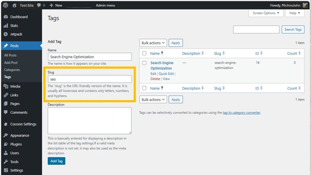 Category is usually used for a line-up of menu bar. Tag is used for “related posts” or leading to other articles. By default,category is “uncategorized” and no tag. It is insufficient for SEO.