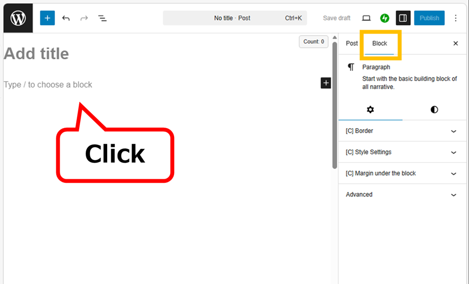 The editing screen is divided by three — right side is “Setting Sidebar” for page/post and block, left side is “Block Inserter”. It can turn on/off with pressing the red circles above.