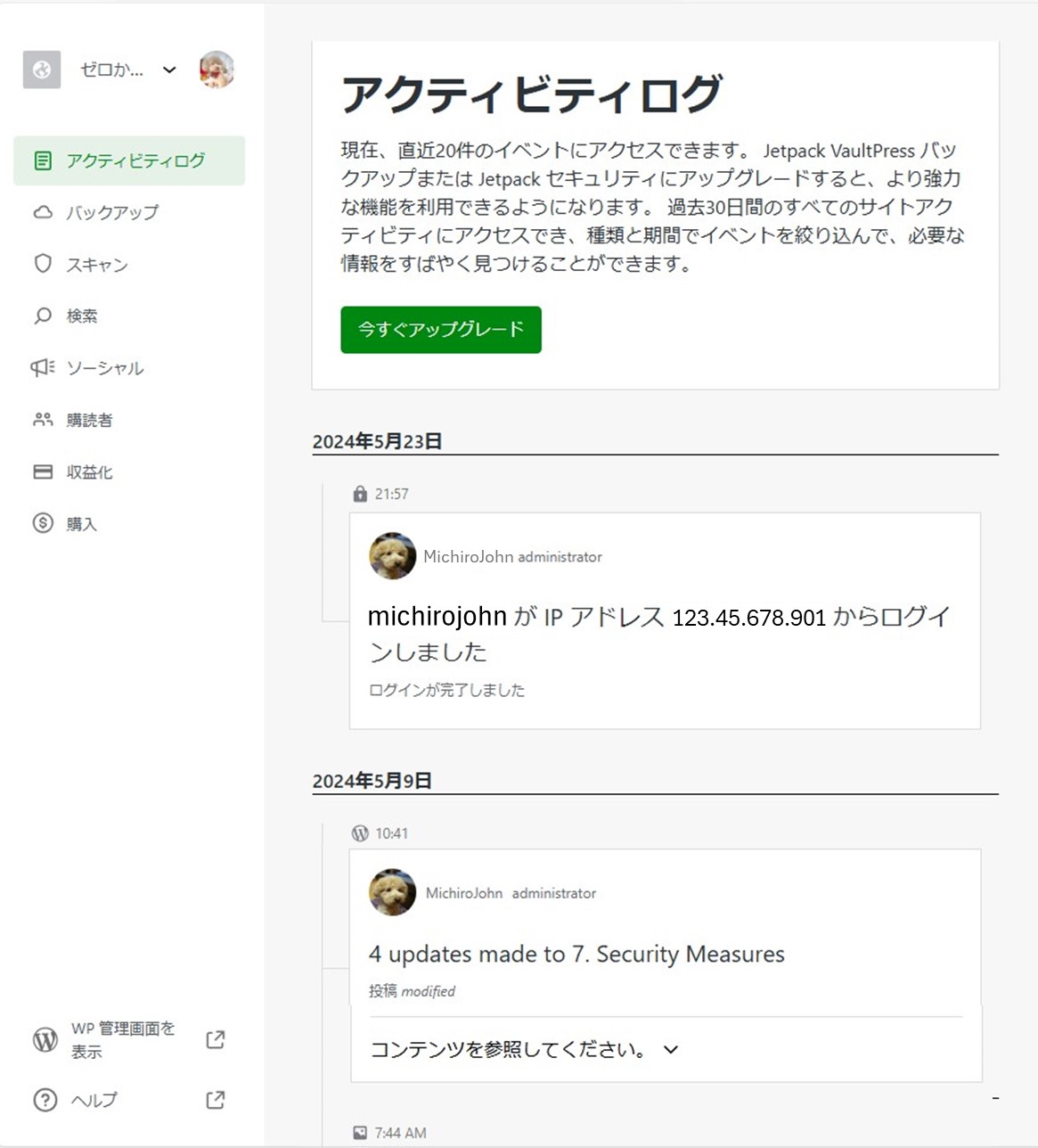 ログイン通知はWordfenceは無料版で使えます。Jetpackは有料版で使えるようになり、通知がありますが、ログインした画面への通知なので、不正アクセスした人間が見ることになります。不正アクセスされたほうは、アクティビティログをこまめにチェックして確認するしかありません。