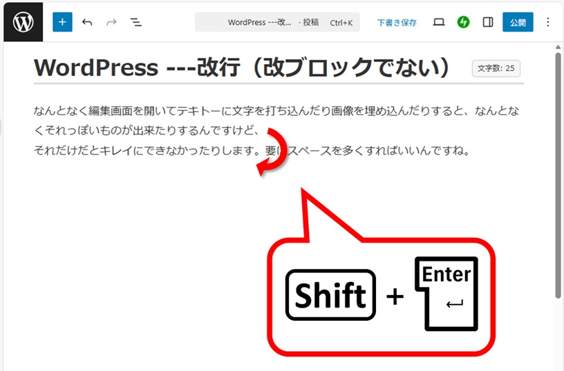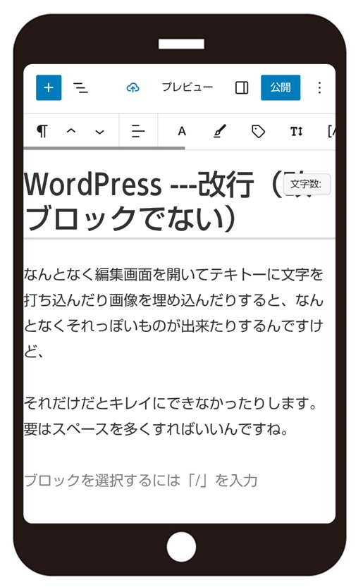 何も考えずにエンターキーを押すと、改行でなく、改ブロックされてしまいます (^^;。