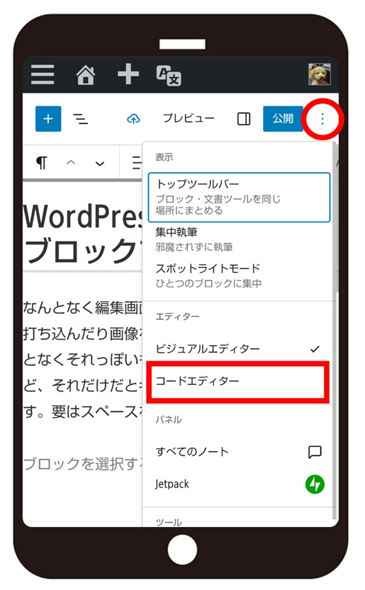 スマホにはシフトボタンがないので、コードエディターを開く必要があります。