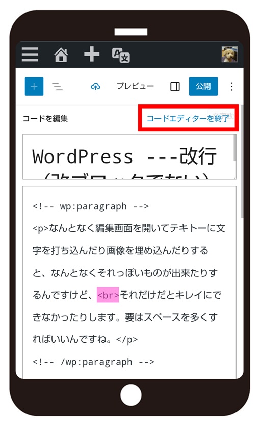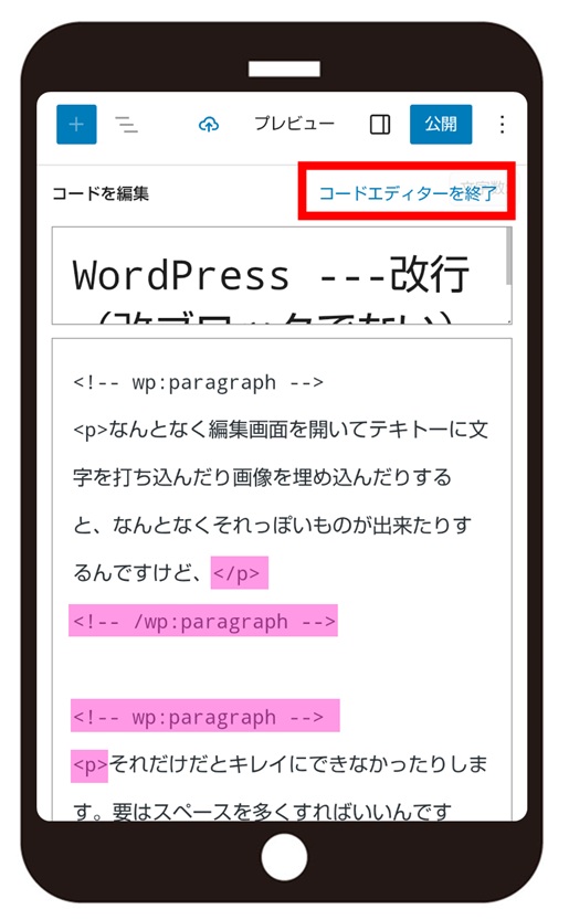 改ブロックを改行に変える場合はピンク色の部分を <br> に打ち換えます。