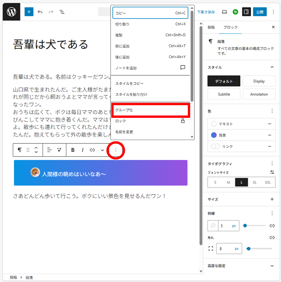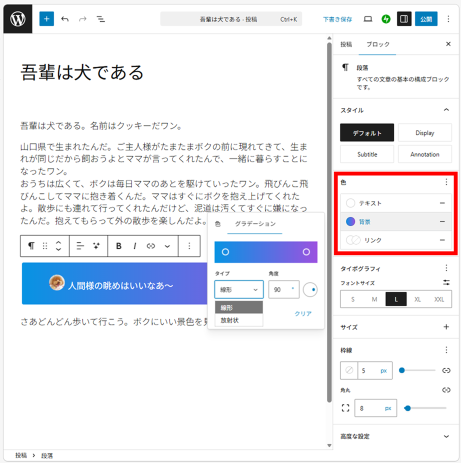 テーマによっては、ここの選択色が増えていきます。またプラグインで増やすことも可能です。自分で設定することもできます。