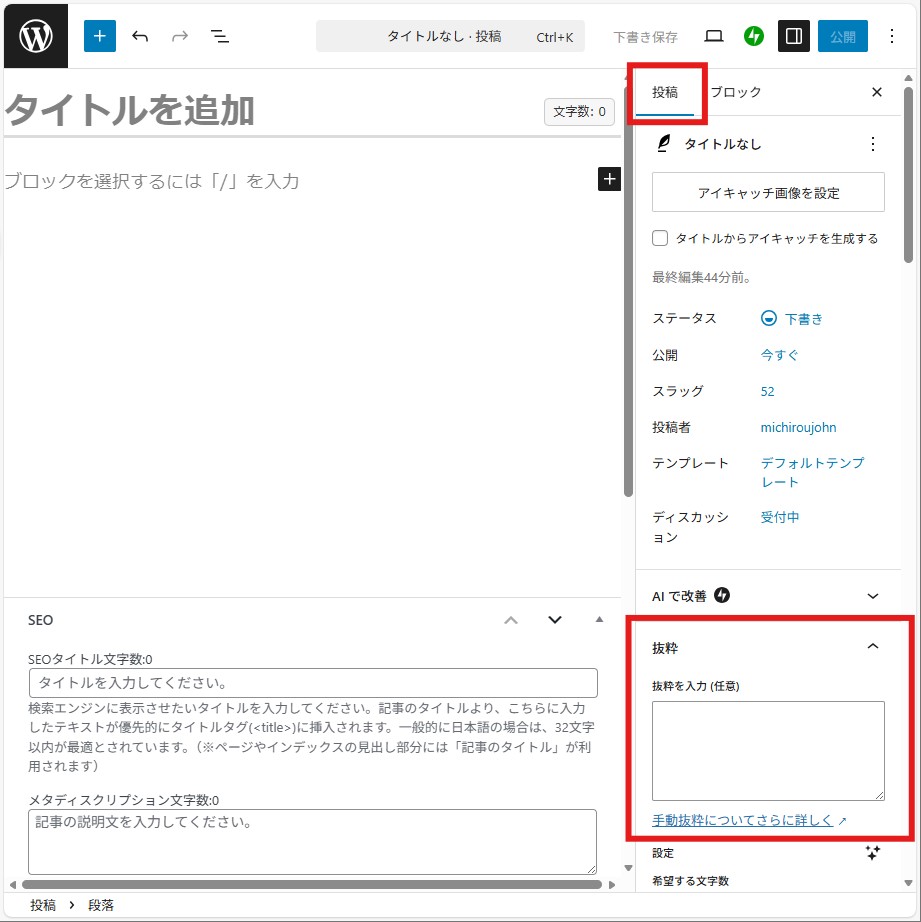 WordPress標準で50文字まで表示できるそうですが、WordPressテーマによってはもっと文字が打てたりします。上がそうですね。何もしないと先頭の文字列が表示されるのですが、先頭にボタンを設定していると、ボタンの文字列が表示されてしまいます。